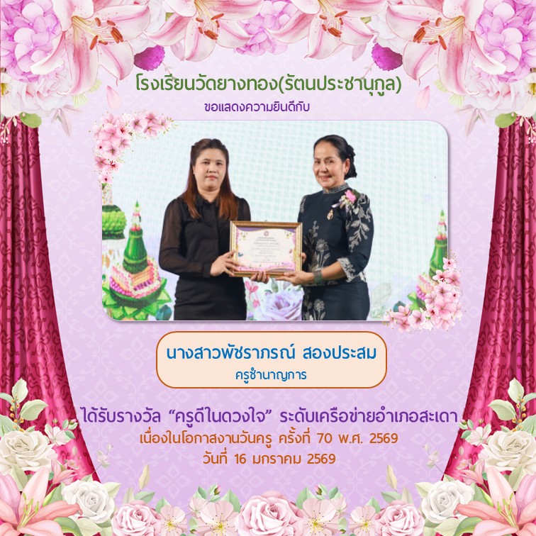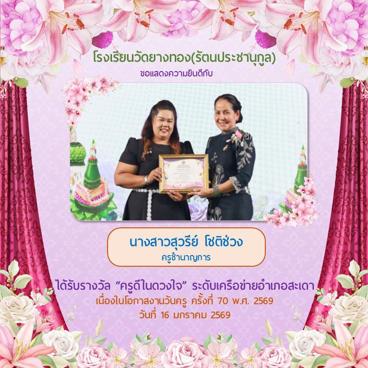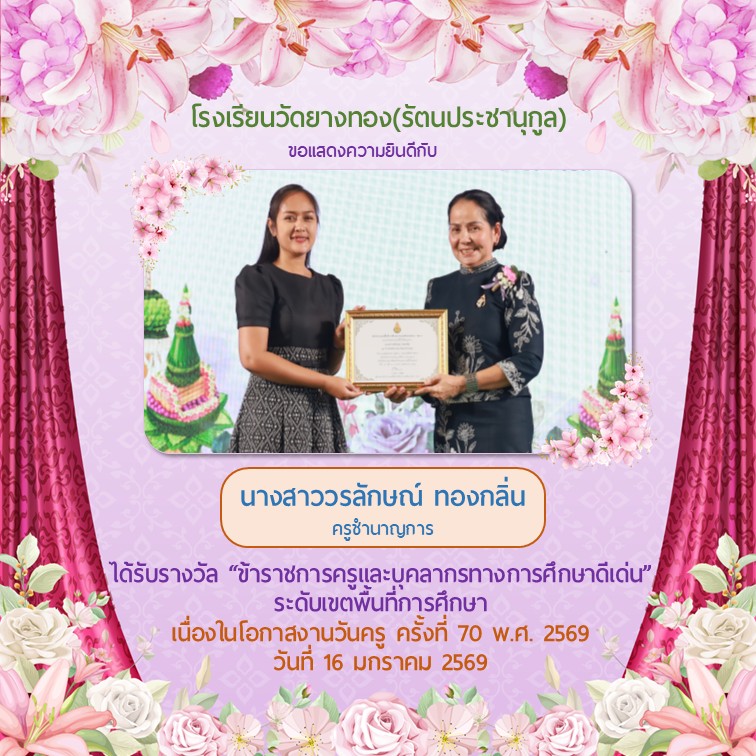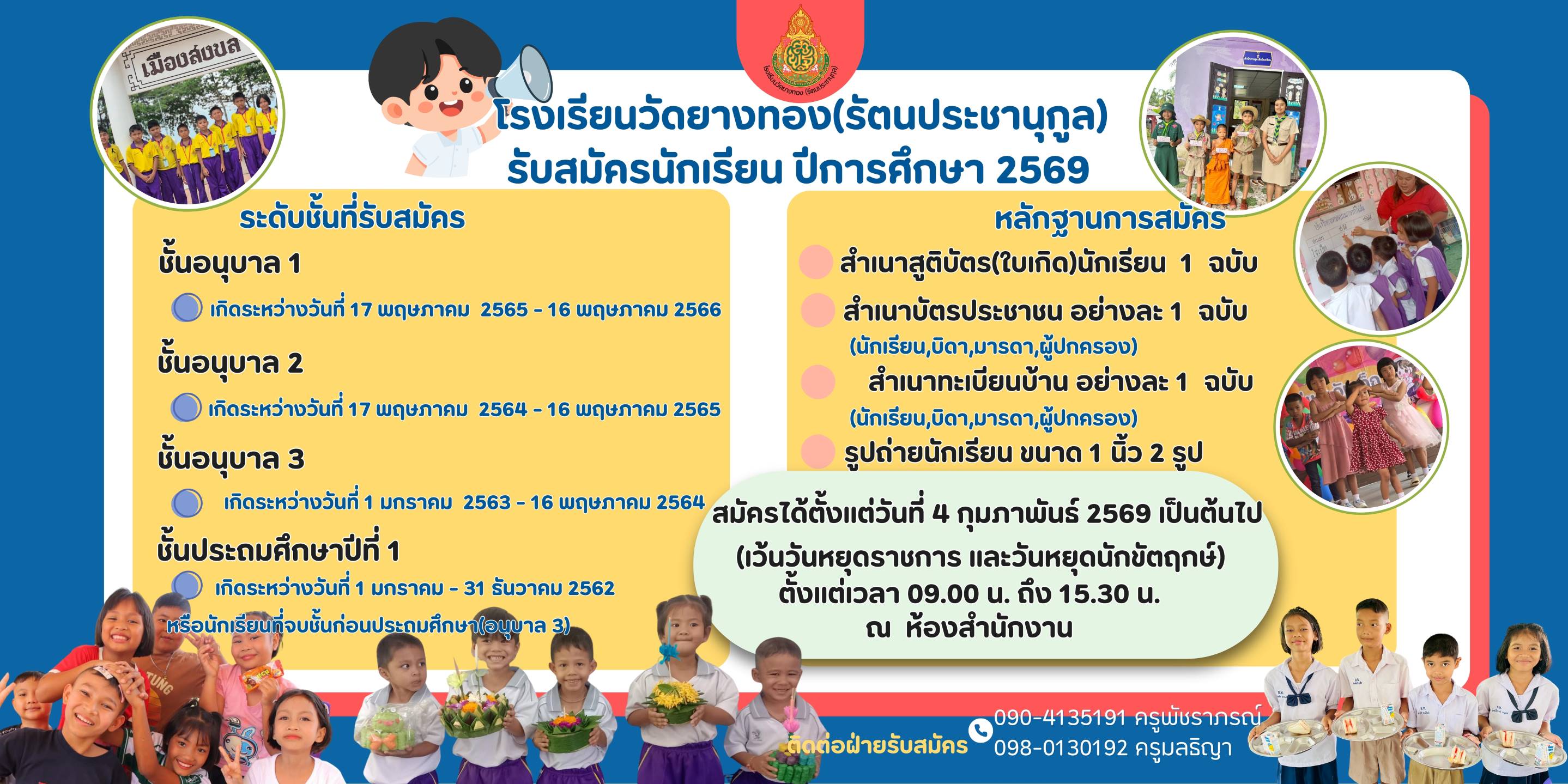 โรงเรียนวัดยางทอง(รัตนประชานุกูล) เปิดรับสมัครนักเรียนประจำปีการศึกษา 2568 ตั้งแต่วันที่ 10 กุมภาพันธ์ 2568 เป็นต้นไป (เว้นวันหบุดราชการและวันหยุดนักขัตฤกษ์) ตั้งแต่ เวลา 90.00 น. - 15.30 น.